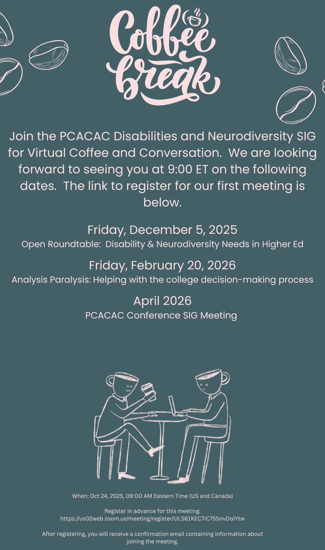 Join the PCACAC Disabilities and Neurodiversity SIG for virtual coffee and conversation. We look forward to seeing you at 9:00 am (ET) on ![]()